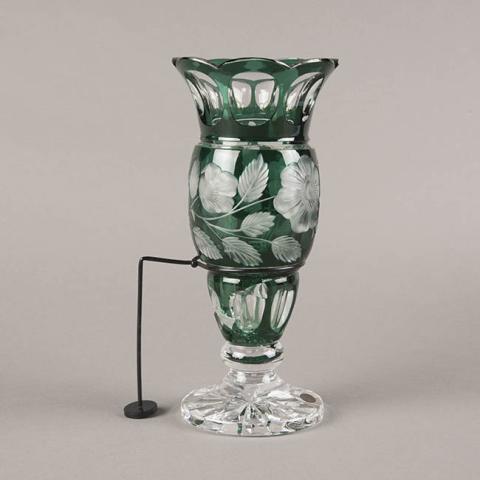 Contenedor de uso decorativo y doméstico, cilíndrico de color verde oscuro y detalles transparentes. Extremo superior, boca evergente de bordes recortado en curvas; el cuerpo tiene la parte media abultada; el extremo inferior es restringido, y se eleva sobre un anillo prominente; el pie es circular plano. Presenta decoración tallada en diseño figurativo, flores y hojas, ubicada en la zona media y también talla en facetas.