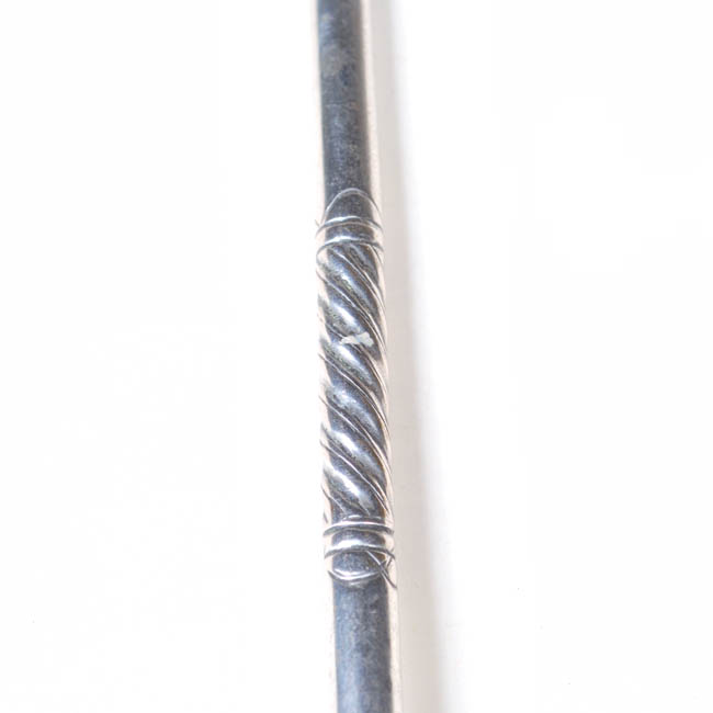 Pieza utilizada para sorber y filtrar infusión de mate, es cilíndrica, estilizada, a un extremo tiene una boquilla recortada y el filtro es globular. Presenta decoración en espirales y argollas.