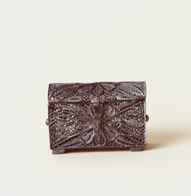 El cuerpo y tapa del objeto está realzado en filigrana de plata. Todas sus caras están decoradas con motivos vegetales, compuestos por una flor central de ocho pétalos con estambre de esfera de plata fundida. Por el borde superior de la cara trasera, se encuentra soldada una bisagra que articula la tapa.