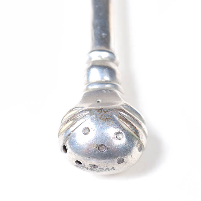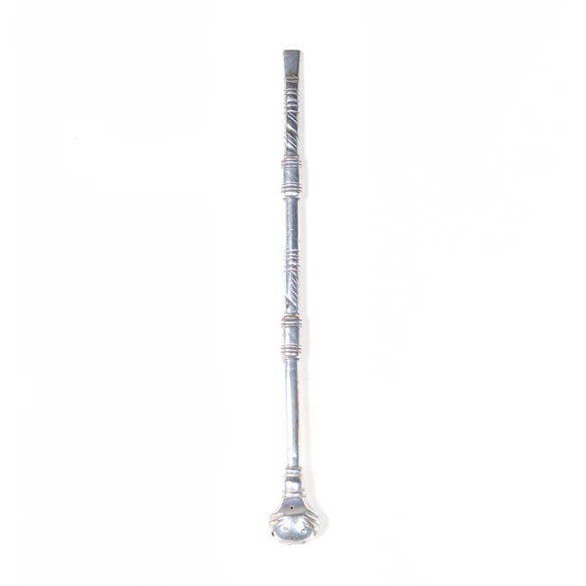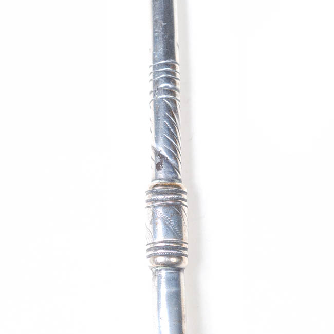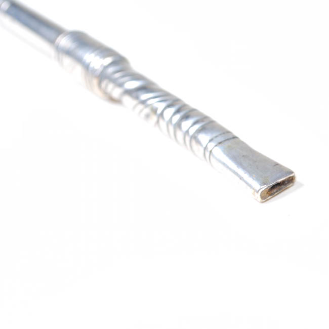 Pieza utilizada para sorber y filtrar infusión de mate, es cilíndrica, delgada; a un extremo boquilla recortada y plana; termina en media esfera con orificios y estrias laterales. Decoración, solo tres anillos en la unión del filtro.