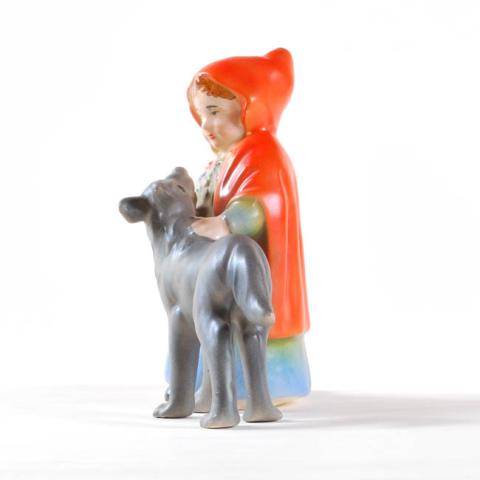 Objeto decorativo. Composición en base a figura femenina de niña de pié, lleva vestido azul y capa con capucha de color rojo, en brazo derecho sostiene un ramo de flores de colores azul, rojo, amarillo y verde. Junto a ella una figura que representa a niña de pie junto a un animal negro, lobo, y una canasta. Al lado derecho abajo canasto de color café. Mano izquierda sobre figura animal de color gris. Esmalte opaco.