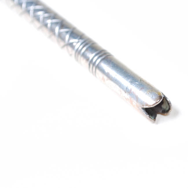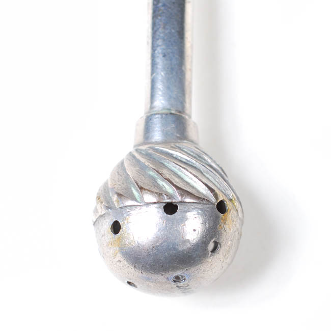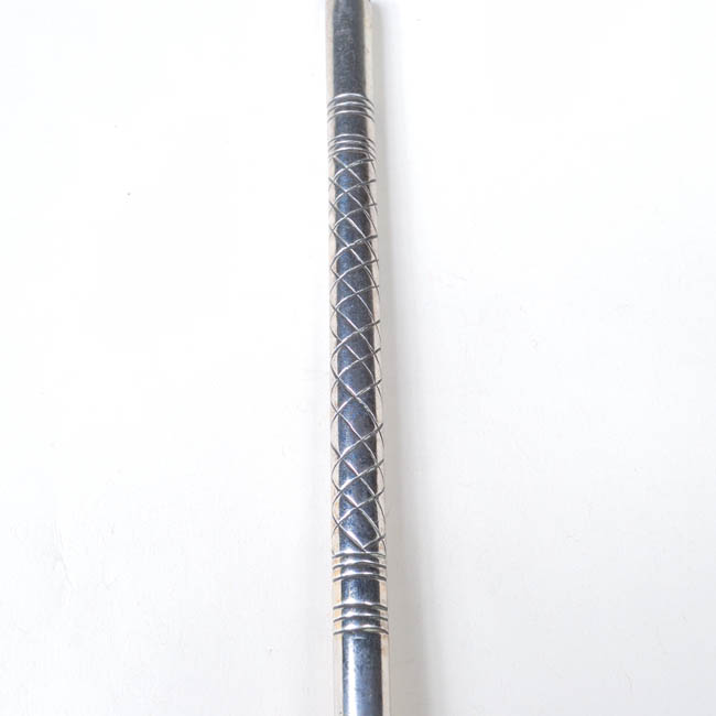 Pieza utilizada para sorber y filtrar infusión de mate, es cilíndrica, delgada; a un extremo boquilla recortada de borde irregular y plana; en la base tiene un filtro en forma de esfera con orificios y estrias. Decoración cincelada forma un relieve de líneas diagonales cruzadas a manera de rejilla.