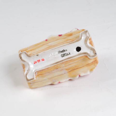 Los objetos producidos por la Fábrica de Cerámica de Lota presentan diferentes tipos de marcas de fábrica que han sido clasificados en 9 grupos por FAIP-N-67-EST 2014. Estudio de caracterización: Cerámica de Lota en el Museo de Artes Decorativas. Este objeto corresponde al Grupo D constituido por la inscripción LOTA en letra manuscrita.