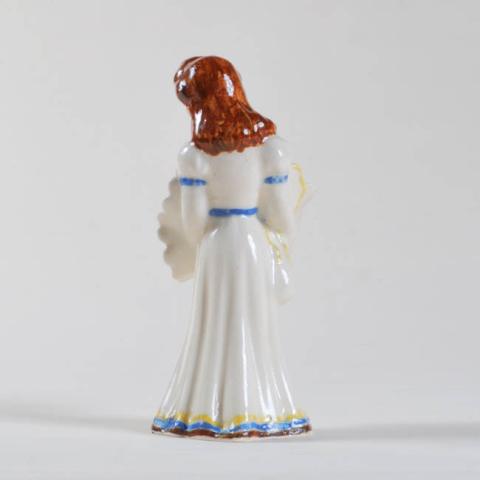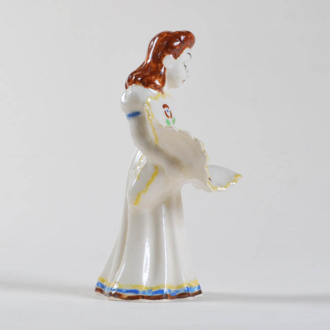 Objeto utilitario. Contenedor para presentar flores, con forma de figura femenina de pie, con vestido largo de color blanco con una franja delgada de color rojo, azul y amarillo en el cuello, mangas, cintura y ruedo. La figura tiene el cabello de color marrón. Sostiene entre sus manos, a la altura de la cintura un elemento circular con decoración en base a flores, con un orificio de forma circular donde se introducen las flores. Posee decorado en esmalte blanco de base y aplicación de color localizado.