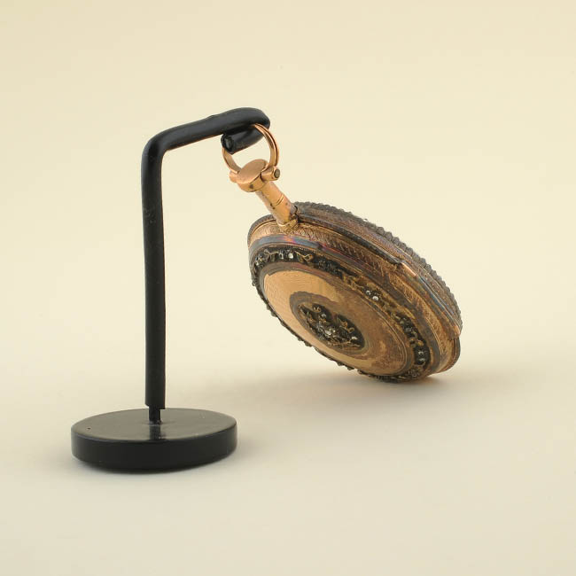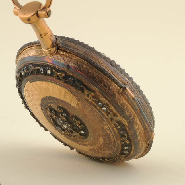 Objeto circular metálico, sobresale argolla a un extremo y cubierta superior de cristal, rodeada de cristales. Interior, números romanos y dos manecillas, sobre esmalte blanco. Tiene una inscripción que se lee "Berthoud"