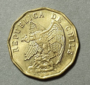 Moneda de forma dodecagonal, con un cóndor a la izquierda en actitud de emprender el vuelo parado sobre una cumbre, sobre él la leyenda República de Chile, bajo el ala derecha la marca de ceca. Por el reverso tiene denominación y año, encerrado por corona de laureles.