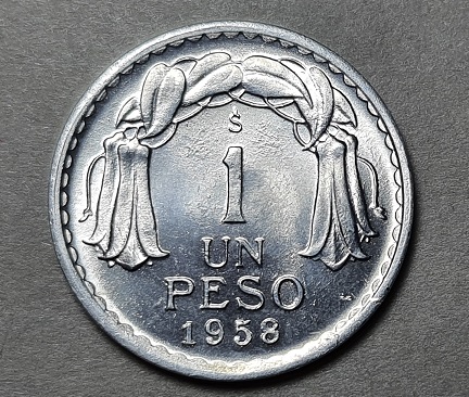 REPUBLICA DE CHILE (Retrato masculino a la derecha) BERNARDO O‘HIGGINS R.Thenot /(guirnalda superior de copihues) So 1 UN PESO 1958