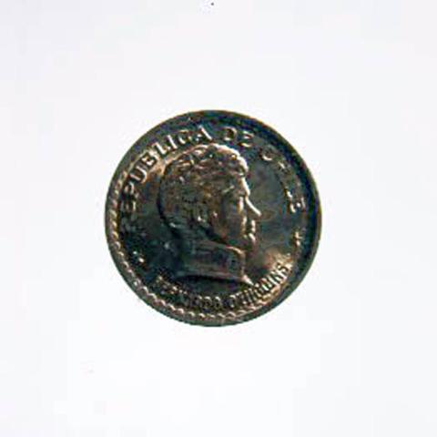 Moneda circular en cuya cara aparece un busto de perfil masculino con la inscripción República de Chile, entre dos estrellas Bernardo O'Higgins. Por la otra cara bajo una guirnalda de copihues, el valor en números, marca de ceca, denominación y año.