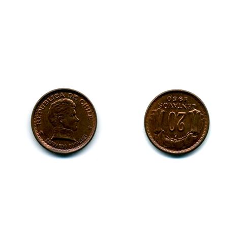 Moneda circular en cuya cara aparece un busto de perfil masculino con la inscripción República de Chile, entre dos estrellas Bernardo O'Higgins. Por la otra cara bajo una guirnalda de copihues, el valor en números, marca de ceca, denominación y año.