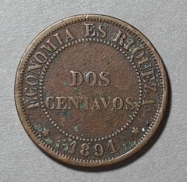 REPUBLICA DE CHILE So (perfil femenino a la izquierda)/ECONOMIA ES RIQUEZA DOS CENTAVOS 1891 (entre estrellas)