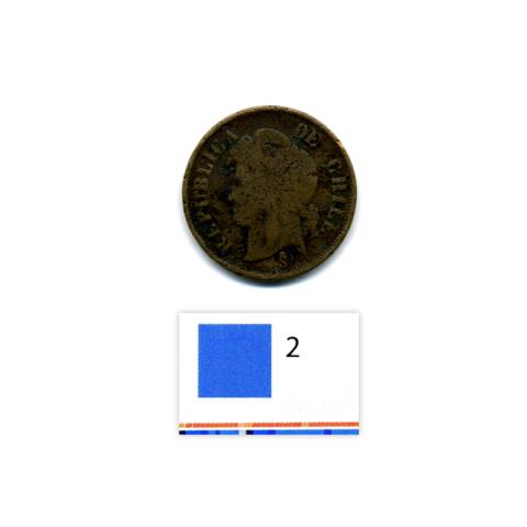 Moneda circular Anv. REPUBLICA DE CHILE. Cabeza de mujer con gorro frigio de perfil a la izquierda. Marca de ceca en la parte inferior. Rev. ECONOMIA ES RIQUEZA. Denominación en palabras rodeada de círculo de perlas. Año de acuñación entre dos estrellas de 5 puntas en la parte inferior.