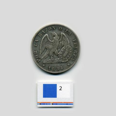 Circuló entre 1853-1862. Se acuñaron 567.000 ejemplares . Popularmente llamado Peso Montt, Chilean Dollar; Moni Manu en la Polinesia. Su alto valor incentivó su exportación y fundición, ocasionando escasez de circulante.