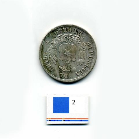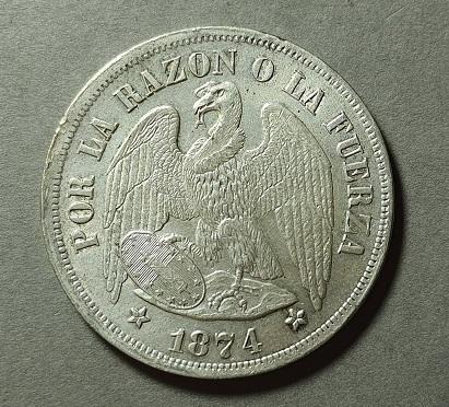 POR LA RAZON O LA FUERZA (Cóndor sosteniendo escudo oval) 1874 (entre estrellas) /REPUBLICA DE CHILE So (Escudo al interior de corona de laureles) UN PESO