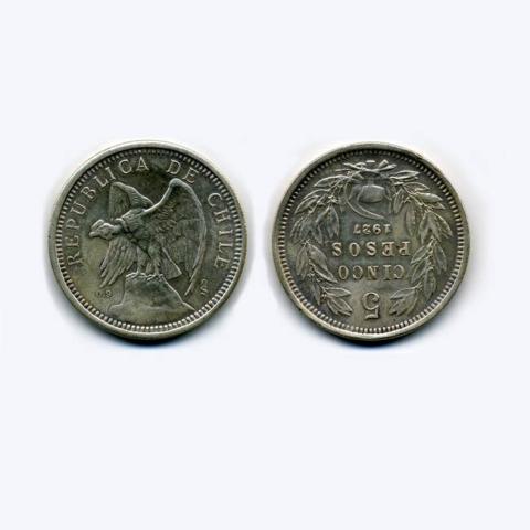 REPUBLICA DE CHILE (Cóndor sobre una cumbre) 0.9 So/ 5 CINCO PESOS 1927 (Corona de laureles, hoz y martillo)