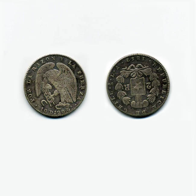 POR LA RAZON Y LA FUERZA 10Ds 20Gs (Cóndor rompiendo cadenas)/REPUBLICA DE CHILE. So L.A. 1852 2R (Escudo dentro de corona de laureles