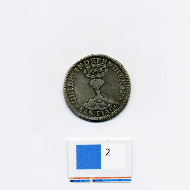 Acuñado por decreto del 6 de febrero de 1824. Primera moneda de Chile independiente con las ordenanzas reales, en el anverso la columna sosteniendo un orbe, alumbrado por los rayos de una estrella, parte del primer escudo republicano. En su reverso, un volcán haciendo erupción en alusión a la fuerza telúrica de la nueva nación.