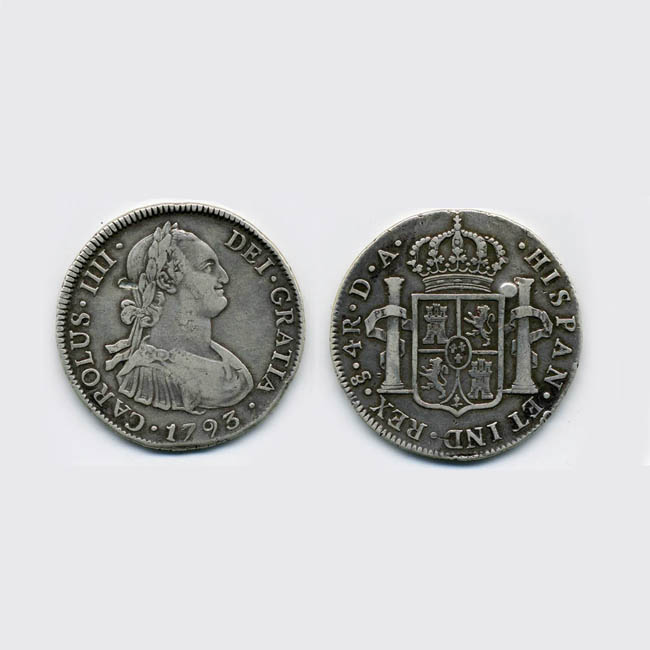 (Busto Carlos IV a la derecha) CAROLUS.IIII. DEI. GRATIA. 1793/ (Escudo Coronado de los Borbones entre columnas de Hércules, con inscripción PLVS VLTRA) HISPAN.ET IND. REX So 4R. D.A.