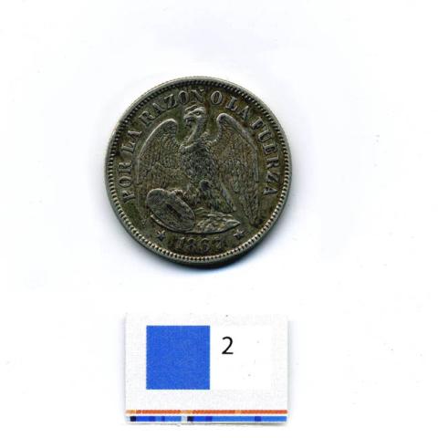 POR LA RAZON O LA FUERZA (Cóndor sosteniendo escudo oval) 1867 (entre estrellas) /REPUBLICA DE CHILE So (Escudo al interior de corona de laureles) 50 CENTs