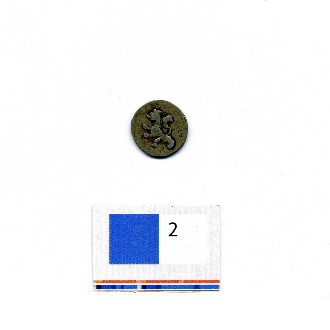 Moneda circular en cuya cara aparece la figura de un castillo almenado, marca de ceca, denominación y fecha. Por el reverso la figura de un león rampante coronado. Amonedación conocida como cuartillo "de castillo y león".