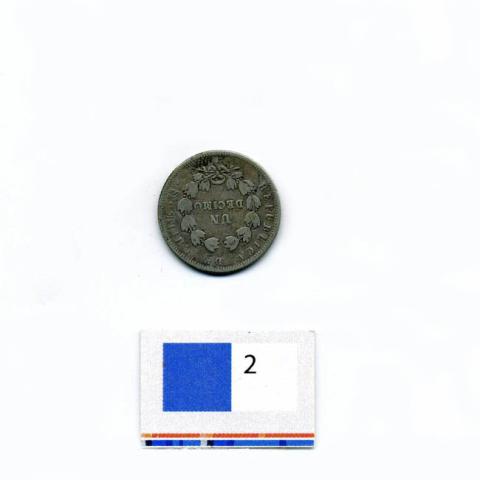 Moneda circular en cuya cara aparece un cóndor con las alas desplegadas, en vuelo. En el sello una corona de hojas rodeando la palabra" UN DECIMO".