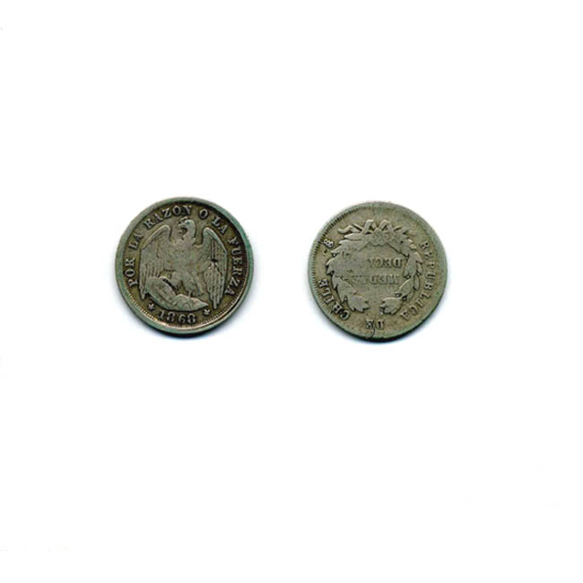 POR LA RAZON O LA FUERZA (Cóndor sosteniendo escudo oval con estrellas) 1868 (entre estrellas) /REPUBLICA DE CHILE So MEDIO DECIMO (al interior de corona de laureles)