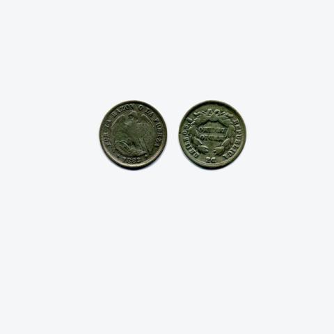 POR LA RAZON O LA FUERZA (Cóndor sosteniendo escudo oval con estrellas) 1883 (entre estrellas) /REPUBLICA DE CHILE 0,5 So MEDIO DECIMO (al interior de corona de laureles)