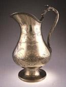 Recipiente periforme, boca amplia en gran curva formando el vertedero. De cuello alto, cuerpo ensanchado globular hacia la base; se eleva sobre pie circular. Asa lateral curva elevada, formada por reptil con cabeza mordiendo el borde. Decoración, bajo relieve fitomorfa. Probablemente fue parte de un conjunto de lavado de jarra y lavatorio.