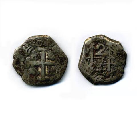 Moneda de forma general redondeada con cantos recortados y espesor irregular. Conocida popularmente este tipo de amonedación como macuquina del tipo columnaria. Tiene por el anverso la cruz de Jerusalén cantonada con escudo cuartelado de Castilla y León. Por el reverso las columnas de Hércules coronadas sobre ondas de mar, denominación y fecha de acuñación.