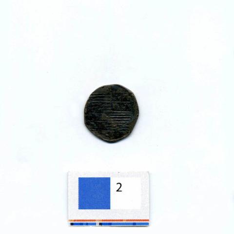 Moneda de forma circular irregular con el escudo de armas de los reyes católicos y marca de ceca. El escudo tiene cuatro cuarteles en uno de ellos aparecen los escudos de Castilla y León y en el otro, las armas de Aragón y Aragón-Dos Sicilias. Por el reverso tiene el yugo y 6 flechas atadas con la punta hacia abajo. Esta recortada, sin las inscripciones por el borde, las que debieran ser de estilo gótico.
