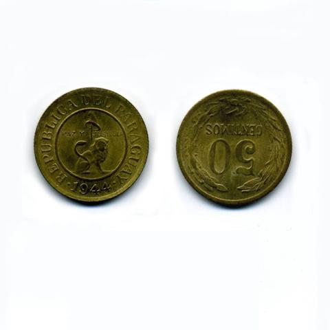 REPUBLICA DEL PARAGUAY.1944. (León de perfil miranda al frente, espada y gorro frigio) PAZ Y JUSTICIA)/50 CENTIMOS (Corona compuesta)