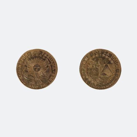 Moneda circular que tiene un sol radiante sobre él, 5 estrellas, tras él cuatro banderas, rodeándolo inscripciones de ceca, denominación y año. Por el reverso dentro de corona vegetal un castillo con la corona del Inca (escudo del Cuzco), un volcán en erupción, abajo una cornucopia, al fondo el mar en cuyas ondas navega un barco, arriba una cruz. Marca de ensayador y ley de fino.