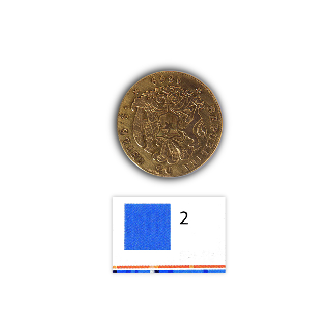 Moneda circular en cuyo anverso hay un escudo heráldico con un cóndor y un huemul rampante. Al reverso una figura femenina de cuerpo completo apoyado sobre un pedestal.