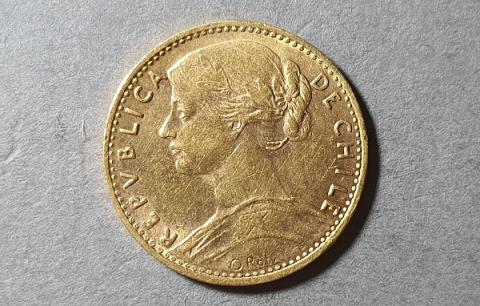 Moneda circular con perfil femenino e inscripción. Al reverso un escudo heráldico , con estrella central coronado por penacho y flanqueado por un cóndor y un huemul rampante. En el centro denominación y año.