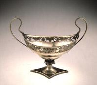 Recipiente de forma ovalada con borde calado con decoración fitomorfa, 2 asas laterales curvas con figura de reptil; fuste terminado en pétalos de flor, base romboide con borde cincelado.