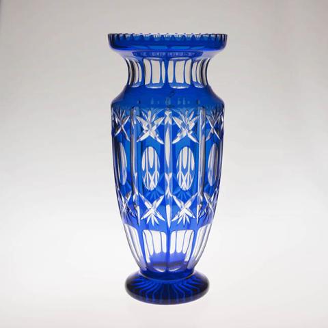 Objeto de uso decorativo, es un volumen cilíndrico de color azul y espacios transparente; al extremo superior tiene una abertura circular, amplia con un borde alto, el cuello forma una estrangulación breve y el cuerpo es estilizado de mayor diámetro en la zona alta y paredes convergen al extremo inferior en una forma aguda y se eleva sobre un amplio pie circular. Presenta decoración tallada en diseño geométrico, una serie de facetas en el cuello y estrías longitudinales, con franjas de segmentos diagonales y una serie elementos elípticos ubicados en la zona media del cuerpo.