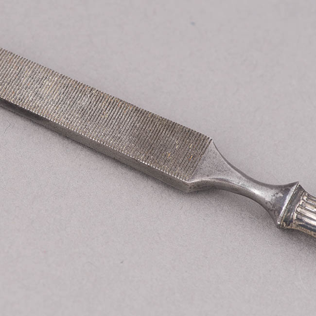 Instrumento de uso personal, utilizado para rebajar las uñas, forma parte de un juego de manicura; es un volumen cilíndrico, de aspecto metálico; al extremo superior presenta una hoja larga y aguda con una textura superficial, se prolonga en un mango cilíndrico y estilizado de borde redondeados y de mayor dimensión en la base. Presenta decoración en relieve con diseño figurativo, son elementos vegetales estilizados y una moldura delgada en todo el borde..