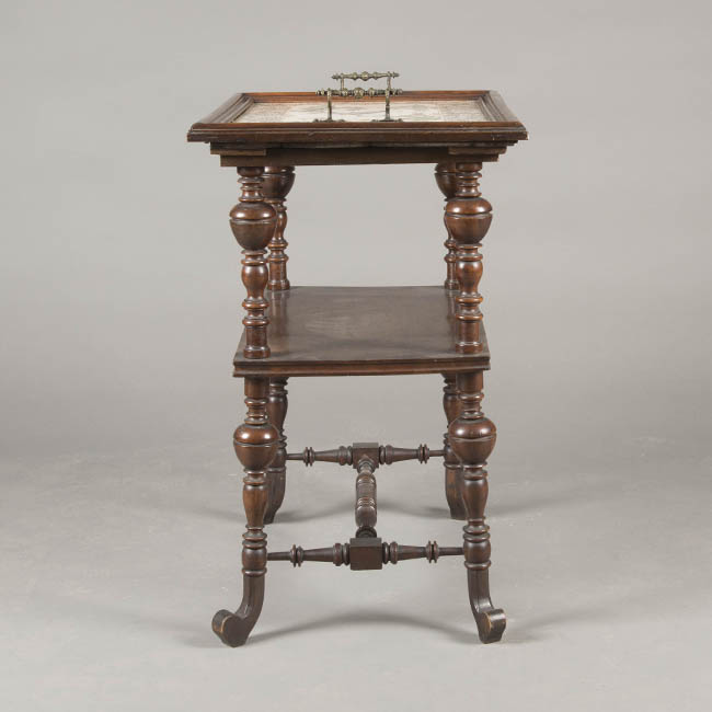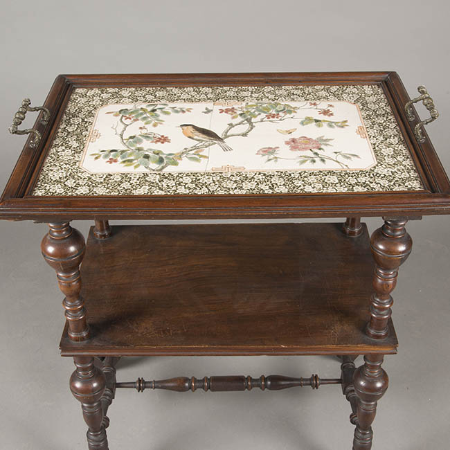 Mobiliario de apoyo. Se trata de una bandeja con patas, movible. La parte superior tiene una cubierta de bandeja rectangular con estructura de madera y placa de porcelana decorada, dos asas metálicas prominentes a cada extremo. Descansa sobre cuatro patas estilizadas y torneadas en forma de balaustre y anillos con cuatro travesaños; en la zona media presenta un panel rectangular de madera. Las patas terminan en curva con un pequeño taco de apoyo. Presenta decoración tallada y la cubierta de cerámica está esmaltada en diseño figurativo de inspiración oriental, un pájaro sobre una rama y flores.