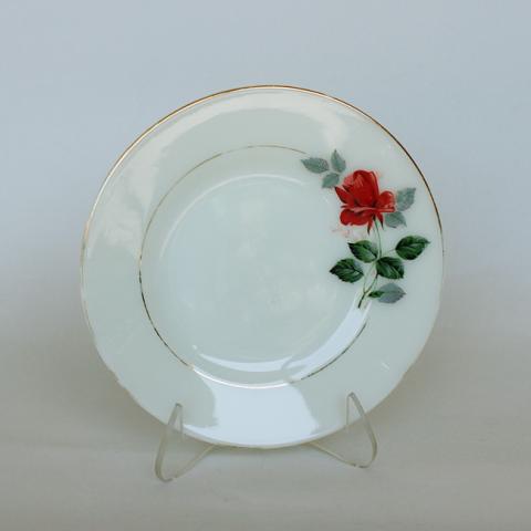 Trio compuesto por una taza y platillo utilizado para tomar té y un plato de pan. La taza es un volumen cóncavo, de aspecto vítreo opaco y color blancor; al extremo superior tiene abertura circular, amplia y el borde es divergente. Las paredes son de perfil en curva y forman una base de menor diámetro. A un extremo lateral tiene un asa en forma curva. El platillo es circular al anverso tiene borde elevado con un relieve en curva y presenta una leve depresión central. La decoración es en diseño figurativo, con una flor roja y hojas verdes, en las tres piezas. El plato de pan repite el diseño.