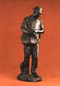 Representación vertical de figura masculina de pie, un campesino de cuerpo completo. Viste sombrero y un delantal o pechera recogida formando un bulto o saco donde lleva las semillas que reparte en la tierra, usa suecos. Brazos junto al cuerpo. Se apoya en su pierna derecha. Se eleva sobre una base ovalada, de relieve irregular.