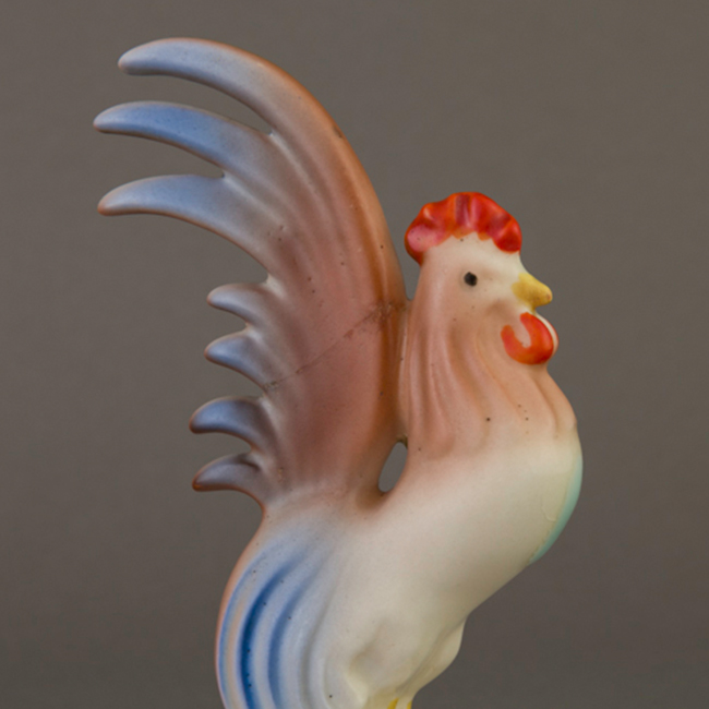 Objeto decorativo, corresponde a la representación de un ave color blanco con cola alta de color celeste y cabeza con cresta de color rojo y pico amarillo, está parado sobre una pequeña base circular, de superficie irregular. Posee decoraciones sobre una base de esmalte blanco con esmaltes de diferentes colores.