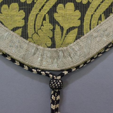 Textil litúrgico cosido de brocado, de forma rectangular con prolongación curva al centro y extremos recortados en curva, fondo negro con decoración figurativa, que repite un patrón con una flor amarilla y hojas del mismo color. Por el borde, tiene aplicación de cinta perlada; de los extremos pende un cordón de hilo de seda perlado y negro terminado en borla y flecos. Reverso presenta tela de seda color morado.