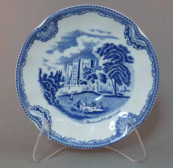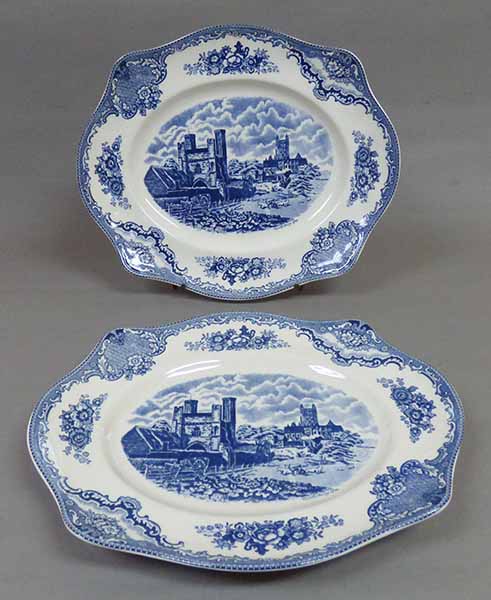 Juego de vajilla para doce personas compuesto por ciento diecisiete piezas. Componentes: tetera, azucarero, salseras, platos hondos, llanos, de postre, de pan, de ensalada, de salsera y platos ovalados. De porcelana blanda o ironstone, color blanco con diseños en azul de la serie de los Castillos antiguos de Inglaterra.