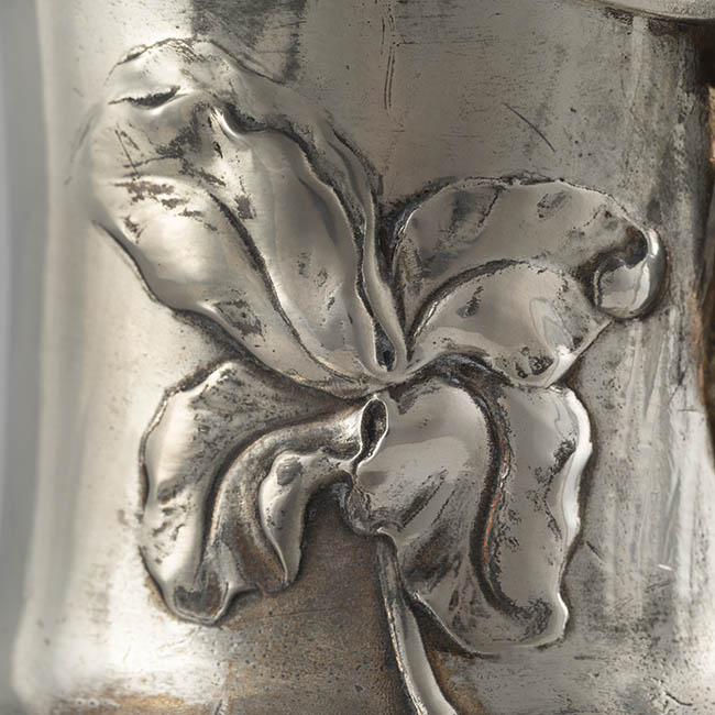 Par de jarras de estilo Art Noveau, de estaño. Tiene decoración en relieve en la zona media del cuerpo y en el cuello con elementos fitomorfos. De cuerpo globular, cuello recto con perfil oblicuo. Tiene tapa unida al cuello a través de una bisagra. Probablemente usado para servir el café o agua caliente. El asa es irregular. La base es dorada.