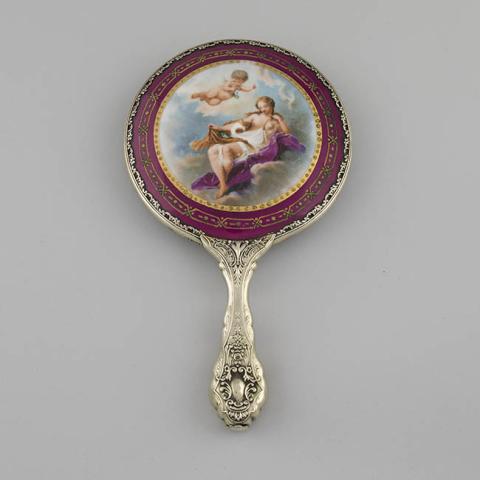 Objeto de uso personal. compuesto por espejo de forma redondeada y mango. De borde biselado con marco y mango de metal, fundido y cincelado con decoraciones florales, vegetales, rocallas y habichuelas. Por la cara opuesta tiene decoración esmaltada con figura femenina. borde color burdeo y plateado.