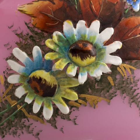 Contenedor decorativo probablemente joyero elaborado en vidrio opalina color rosa en degradé, pintado a mano. Tiene una tapa, también decorada con flores y mariposas pintadas en la parte central al igual que el cuerpo, de colores azul, amarillo y naranjo. El interior es blanco.