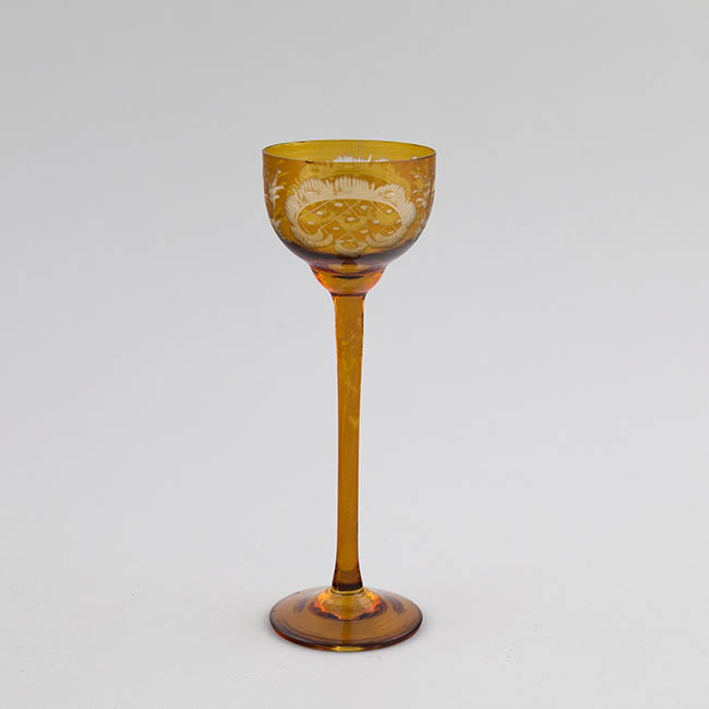 Copas de color ámbar estilo bohemio, de pie alto probablemente para tomar bajativos o licores dulces. Tiene un diseño tallado con motivos fitomorfos y zoomorfos. El pie es liso.