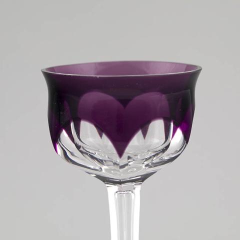 Copa de cristal que se usa para tomar licores dulces o bajativos. De color morado con corte en la base del cuenco en que se asoma en medios círculos o pétalos transparente. El cuenco es en forma de campana invertida, con el borde levemente evertido. El pie es liso y circular. El fuste es liso y tubular.