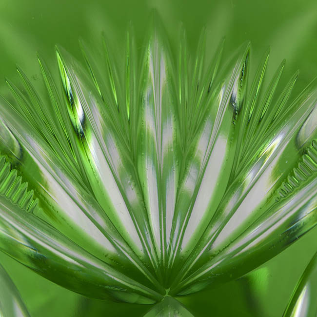 Copa de cristal cortado y coloreado que se usa principalmente para vino. Una copa verde, una azul y otra rosa. El cuenco es decorado en base a cortes tallados en forma de círculos y motivos lineales estrellados y tiene forma de campana invertida con el borde levemente evertido. El fuste facetado tiene forma de pedestal con un florón. El pie es redondo con cortes radiales a modo de decoración.
