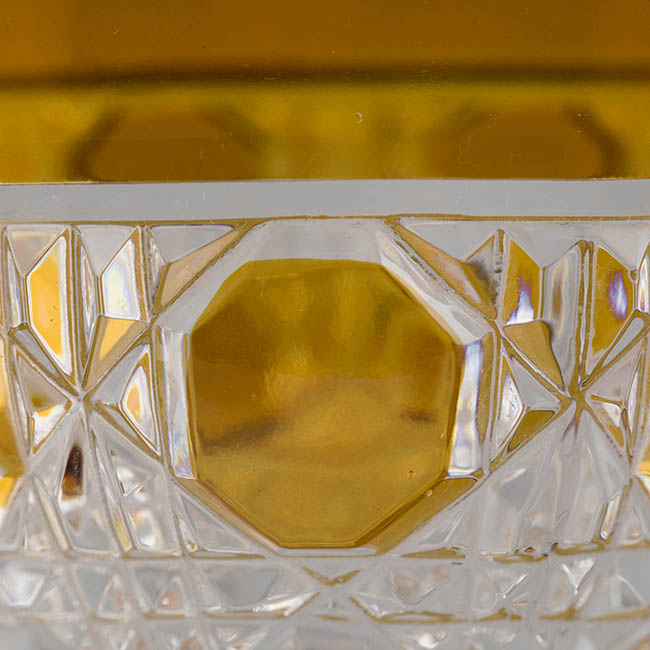 Copa de vidrio doblado y tallado que se usa principalmente para vino. Amarillo ocre. En la decoración de cáliz tenemos desde la base tallado transparente y profuso, en la zona media de color amarillo oscuro u ocre tallados en forma de octógonos. La zona superior es del mismo ocre pero forma una franja lisa hasta el borde. El fuste es en forma de pedestal, facetado con talla suaves en los ángulos de las caras en forma de cortes. La base es redonda, transparente y lisa.