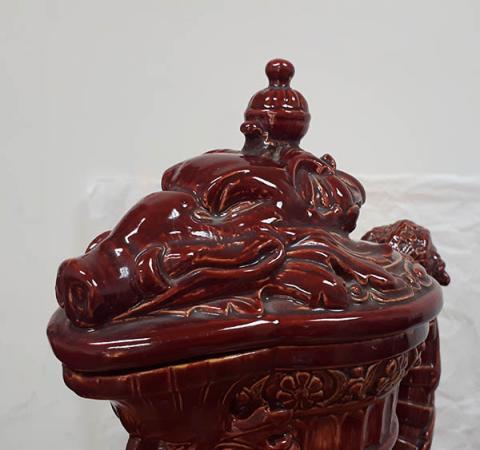 Jarro con tapa de gran tamaño. Realizado en cerámica esmaltada en rojo, moldeada y profusamente decorada en diversas secciones. La tapa tiene la forma de una cabeza de jabalí. El cuello tiene un rostro de un fauno con la boca abierta sobre un escudo sin inscripciones, que sostienen dos personajes.